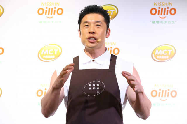 「日清MCT オイルHC」のアンバサダーを務めるきんに君は、「脂肪燃焼」と書かれたエプロンを身に着けて登場。コーヒーに「日清MCT オイルHC」を注ぐパフォーマンスを披露した。約5年の愛用歴があり、使うようになったきっかけについて「ボディビルディングの大会に向けての減量をきっかけに使うようになりました。よりエネルギーになるということで(中鎖脂肪酸の機能に)注目しています」と明かした。