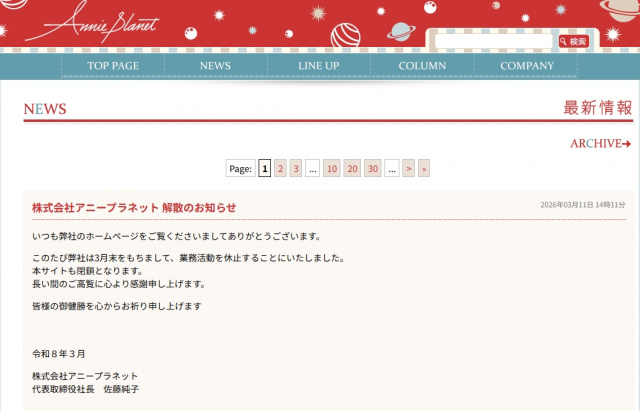 同社は、代表取締役・佐藤純子社長の名義で文書を掲載。「株式会社アニープラネット 解散のお知らせ」と題し、「このたび弊社は3月末をもちまして、業務活動を休止することにいたしました」と報告。「本サイトも閉鎖となります。長い間のご高覧に心より感謝申し上げます」と感謝をつづり、「皆様の御健勝を心からお祈り申し上げます」と結んだ。