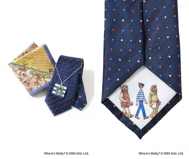 今回登場した商品は、世界累計7000万冊以上を売り上げ、38ヵ国・30言語に翻訳されているベストセラー絵本『ウォーリーをさがせ!』の世界観を落とし込んだコラボ第2弾。ネクタイとハンカチには、絵本「WHERE’S WALLY NOW?」のストーリーをモチーフにした全12種類の旅シーンが描かれ、ネクタイの裏地と小剣に登場するキャラクターやアイテムをハンカチの中から探す仕掛けになっている。