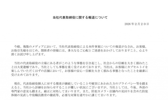 その上で「現在、代表取締役個人に対する捜査が継続していることや被害にあわれた方のプライバシー等を踏まえると、当社から詳細をお知らせすることが難しい状況にございますが、当社としては、今後、外部の専門家の意見も踏まえ、厳正に対処してまいります。また、防犯カメラ・店舗内の見回りを含めた防犯体制の見直しや役職員教育の徹底等、必要な対策を速やかに講じてまいります」とつづった。