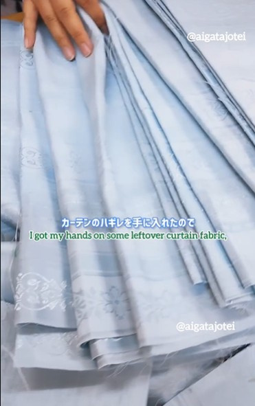 薄いブルーに同色の織柄が入った上品なカーテン生地。この余り布が…?