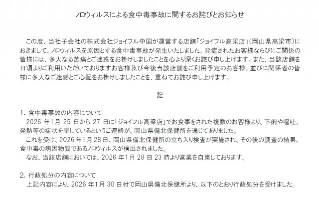 「2026年1月25日から27日に『ジョイフル高梁店』でお食事をされた複数のお客様より、下痢や嘔吐、発熱等の症状を呈しているというご連絡が、岡山県備北保健所を通じてありました。これを受け、2026 年1月28 日、岡山県備北保健所の立ち入り検査が実施され、その後の調査の結果、食中毒の病因物質であるノロウィルスが検出されました」と明らかにし、「なお、当該店舗においては、2026年1月28日23時より営業を自粛しております」と説明した。