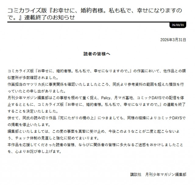 「月刊少年マガジン編集部はこの事態を極めて重く捉え、Palcy、月マガ基地、コミックDAYSでの配信を停止するとともに、コミカライズ版『お幸せに、婚約者様。私も私で、幸せになりますので。』の連載を終了することを決定いたしました」と伝えた。