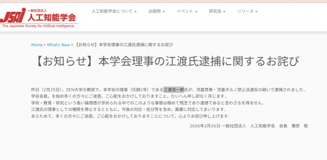 「昨日(2月25日),ZEN大学の教授で,本学会の理事(任期2年)である江渡浩一郎氏が,児童買春・児童ポルノ禁止法違反の疑いで逮捕されました.学会会員,を始め多くの方々にご迷惑、ご心配をおかけしておりますこと,たいへん申し訳なく存じます」と報告。