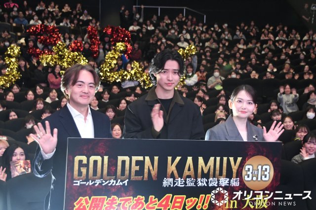 俳優・山崎賢人(※崎=たつさき)、山田杏奈が9日、大阪市内で行われた映画『ゴールデンカムイ 網走監獄襲撃編』公開直前舞台あいさつに、松橋真三プロデューサーとともに登壇した。