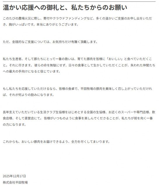 金銭的な支援については「お気持ちだけ有難く頂戴します」とし、「私たち生産者、そして豚たちにとって一番の救いは、育てた豚肉を皆様に「おいしい」と食べていただくこと。それに尽きます。 彼らの命を無駄にせず、日々の食事として生かしていただくことが、失われた仲間たちへの最大の手向けになると信じています」と続けた。