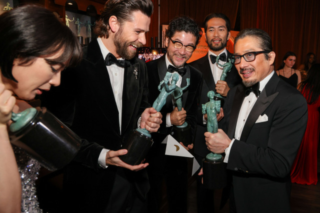 「第31回全米映画俳優組合賞」(2025年2月23日)で4冠達成を喜び合う『SHOGUN 将軍』チーム(左から)穂志もえか、トミー・バストウ、浅野忠信、阿部進之介、真田広之(写真:REX/アフロ)
