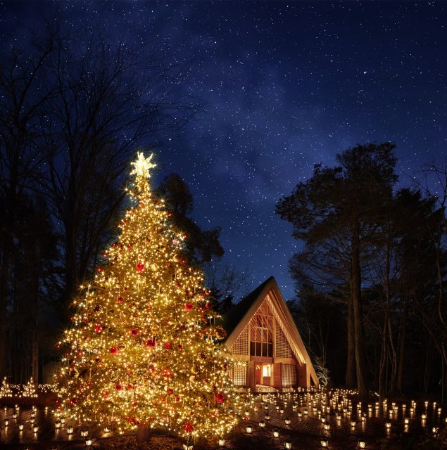 星降る森にたたずむ軽井沢高原教会とクリスマスツリー
