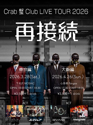 現在開催中のCrab 蟹 Club LIVE TOUR 2026 - 再接続 - は、3月28日に東京編を終え、4月26日(日)に心斎橋Pangeaで大阪編が開催される。曲名とツアータイトルが呼応する本ツアーは「接続」の世界観を、そして新生Crab 蟹 Clubとしての覚悟を、ライブの熱量とともに体感できる機会となりそうだ。