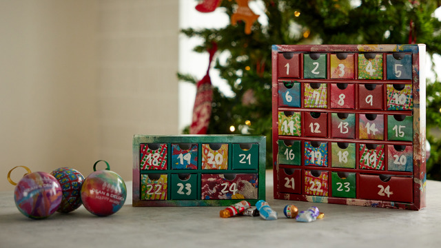 今年のテーマは“準備のひととき”を豊かにすること。作家やつくり手とともに仕上げたラインナップが並ぶ。なかでも注目は、鹿児島の知的障がい者支援施設「しょうぶ学園」の利用者が描いたアートを用いたアドベントカレンダーとホリデーオーナメント缶。サンタクロースやコイン型チョコなどの菓子が入っており、日ごとに窓を開けながらクリスマスまでを楽しめる。アドベントカレンダーは24日間タイプ(3600円)と7日間タイプ(1800円)の2種類を展開する。