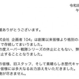 テレビ朝日系の特撮「スーパー戦隊シリーズ」の企画協力などを手がけた「株式会社 企画者104」が16日、Xを通じて業務活動...