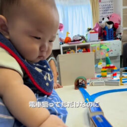 兄姉が電車のおもちゃで遊ぶ中、末っ子がいつの間にか部屋の隅に追いやられてしまう様子を撮影した動画がInstagramで話...