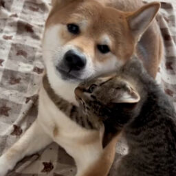 ストーブの前で寝そべる柴犬のあんずちゃん。その上から子猫のゆずちゃんが首に抱きつき、そのまま激しく顔をすりつける。ゆずち...